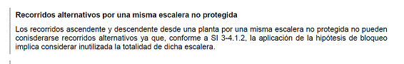 Lo que me hace dudar es la referencia a hipótesis de bloqueo ya que en caso de que quedara inutilizada la escalera siempre existiría la posibilidad de evacuación a través de la otra salida existente (en el caso de sótano a través de zonas comunes y en planta baja a través del acceso desde calle) y en caso de que quedara bloqueada la salida se podría utilizar la escalera para comunicar con la salida existente en la otra planta.