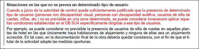 Todo depende de lo que en cada caso particular resulte de la aplicación de la excepcionalidad recogida en el RD 364/2005. Cuando de dicha aplicación resulte que no es previsible la presencia de personas con un determinado tipo de discapacidad, véase lo que al respecto dice un comentario publicado por este Ministerio: