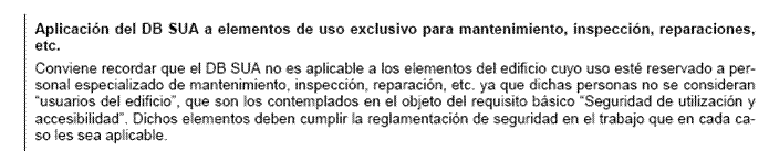 En efecto, el comentario del DB SUA que señala es también válido a efectos del DB SI, el cual tampoco es aplicable a las condiciones de evacuación de zonas de uso exclusivo por personal especializado en mantenimiento, reparaciones, etc., ni a los elementos destinados a dicho personal: escalas, accesos, etc.